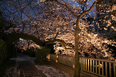 いでゆ橋から通学橋までの区間約360メートルで、34本の桜をハロゲンライトで照らします。