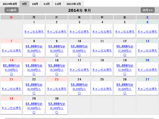 プラン詳細画面にてご希望のプランの内容・料金をご確認いただきよろしければ下部の空室カレンダーに記されている「○」マークおよび「▲」マークをクリックしてください。「キャンセル待ち」の表記は満室となっておりますがキャンセル待ちにてご予約いただけます。