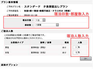 こちらの画面からお客様のご希望の情報を ご入力いただきます。ご希望の宿泊日数お部屋数、ご人数を ご入力します。また、別注料理やなどのオプションの申し込みもこちらの画面で ご予約いただけます。