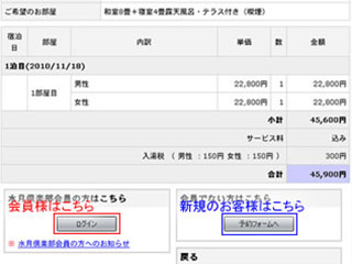 こちらの画面でお申し込みのお見積もりが表示されます。ご宿泊プラン、人数、お日にちなどお申し込み内容と料金をご確認いただき下部にございますボタンにて次画面に進みます。