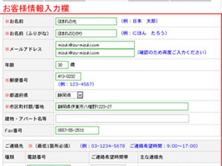 お名前、メールアドレス、ご住所、お電話番号などのお客様情報をご入力いただきます。※印のものは入力必須項目ですので必ずご入力いただきそれ以外の部分は必要に応じてお客様の情報を ご入力くださいませ。